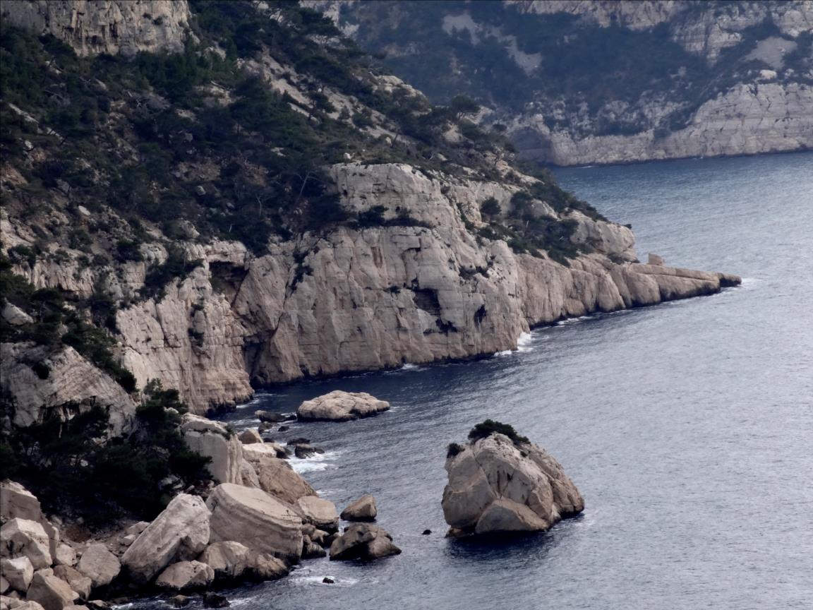 Notes de 2005 : l'approche part de l'école d'architecture de Luminy. Suivre la large piste qui passe au col de Sugiton, continuer presqu'en face par la large piste balcon, tracé rouge. Descendre par cette piste (sans prendre plus loin à droite celle qui plonge vers Sugiton) jusque vers le socle de la Candelle. Peu avant le socle, au niveau d'une croupe boisée, un sentier raide descend sur la droite et on arrive en haut de la falaise des Pierres Tombées. Un couloir à l'Est (gauche en regardant la mer) descend alors à la mer par un court passge de désescalade. Traverser ensuite complètement le chaos rocheux vers l'Es. Le départ est dans un étranglement rocheux, spits. On sera surpris dans la 5è longueur par la disparition apparente des spits, mais en fait il faut passer dans une goulotte intérieure pour les retrouver... très amusant.